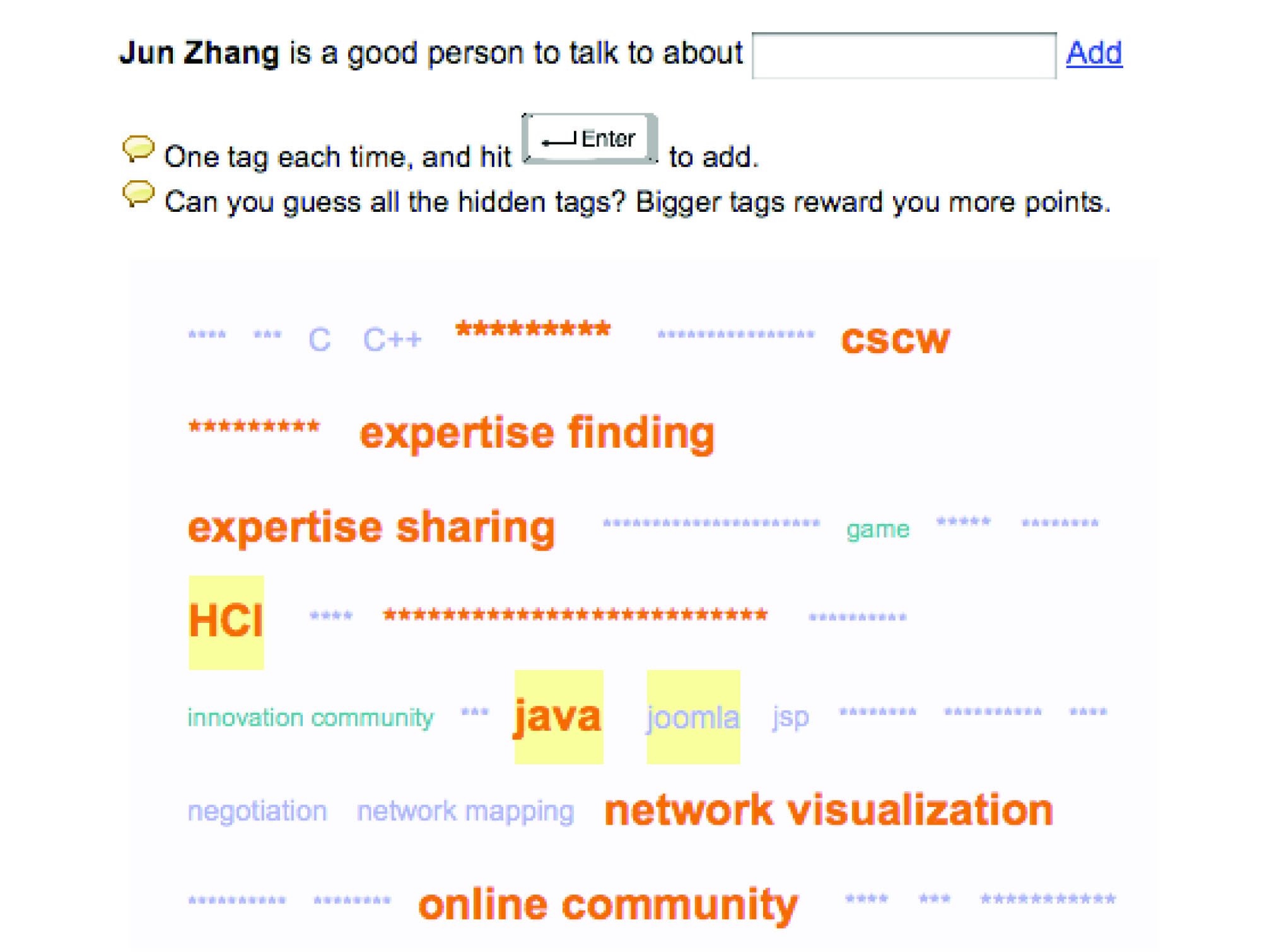 Here is how the game works: “A person’s expertise tags are presented in a masked tag cloud when the game starts. A user starts playing this game by typing a keyword in the text