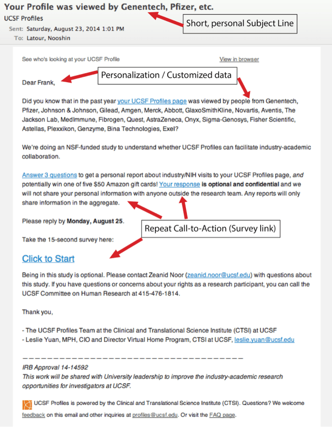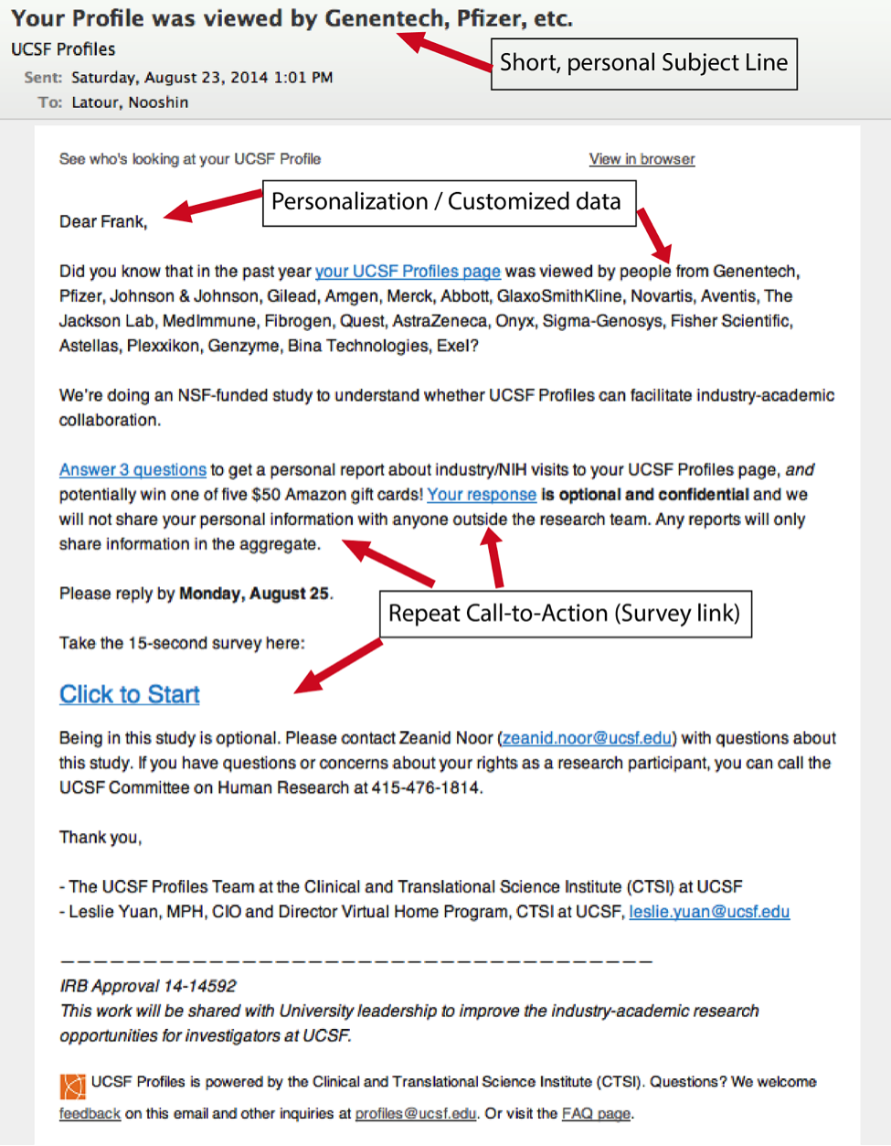 Lessons learned after achieving a high email survey response rate for a recent NSF Grant Study on UCSF Profiles. Brought to you by Anirvan Chatterjee & Nooshin Latour